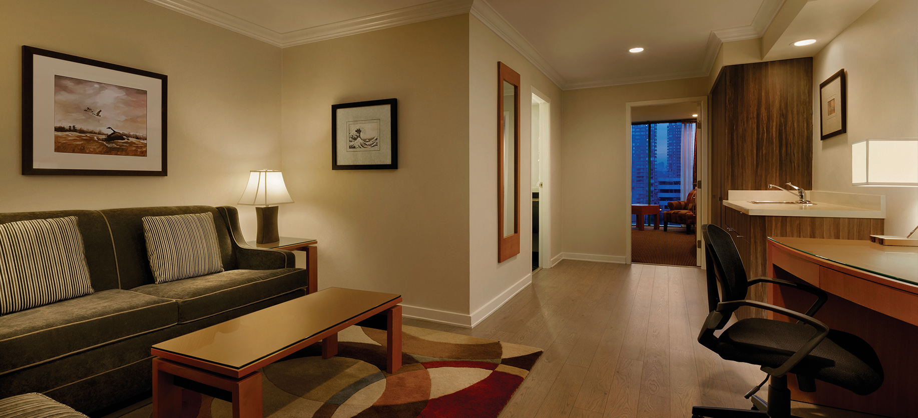 Beautifully appointed suite many with city view, one king bed, relaxed living room with plush sofa pull out bed, designer rug, fridge, wet bar with sink, coffee maker, microwave, 2 HD TVs, On Demand movies, 2 phones, full length dressing mirror, and bath robes.
